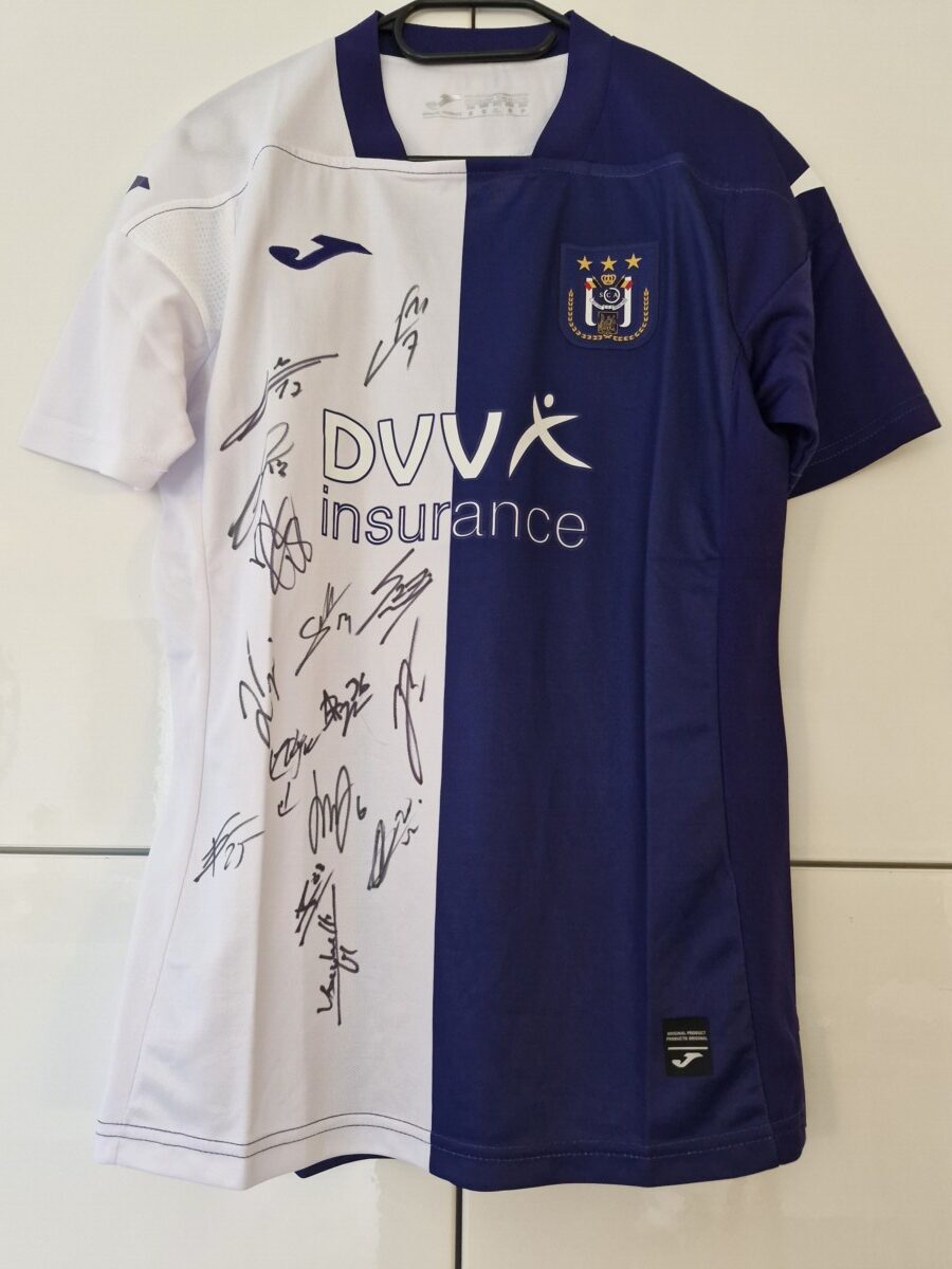 Gesigneerd shirt RSC Anderlecht, afkomstig via Futures-speler Joren Dom. De handtekeningen zijn van de eerste ploeg seizoen 2024-25, het truitje is van seizoen 2023-24.